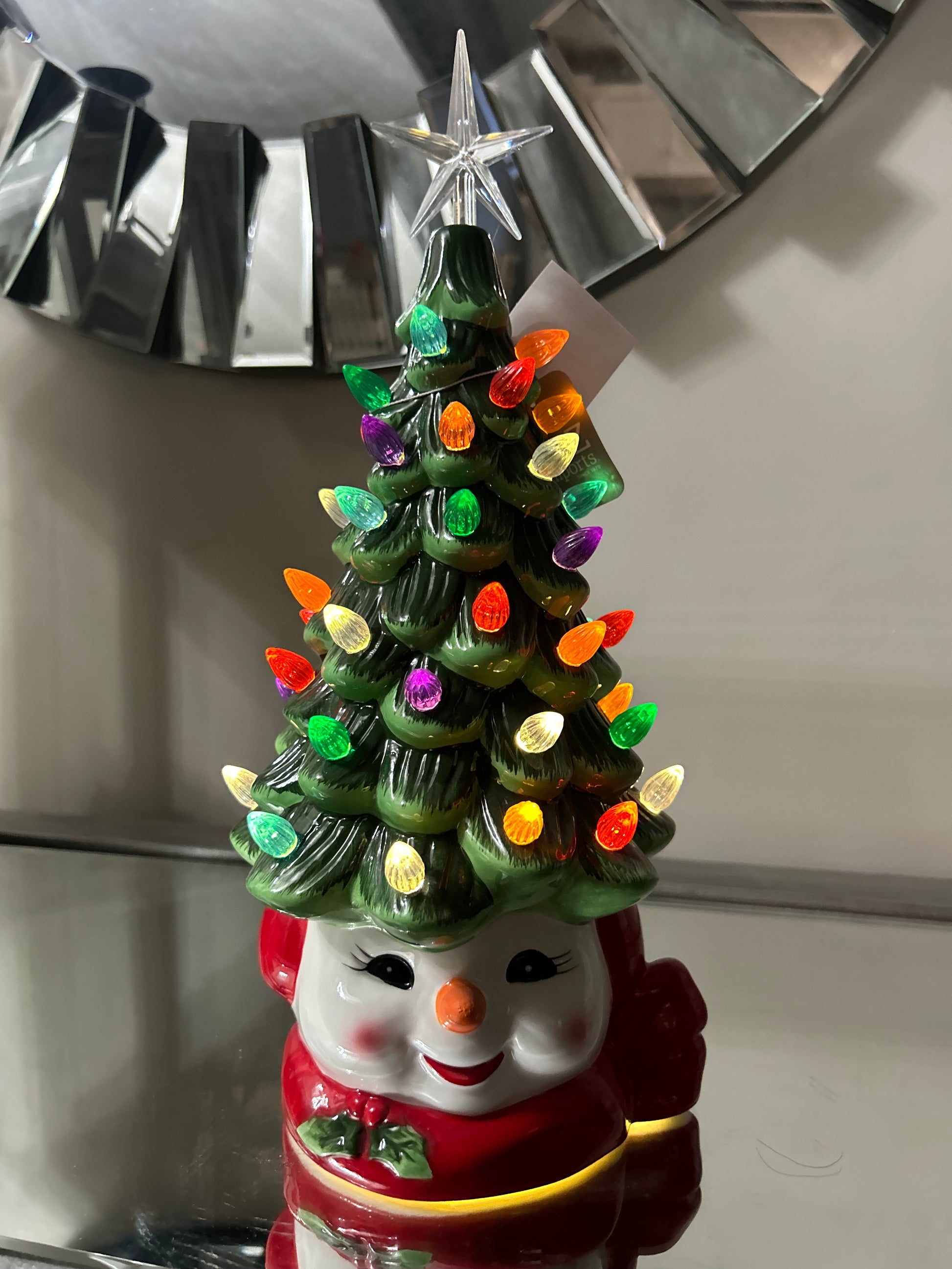 This 13" vintage snowman lighted tree is made of porcelain and features a charming snowman hat with a classic Christmas tree on top, adorned with a star. Bring nostalgia and enchantment to your holiday decor with this magical piece.