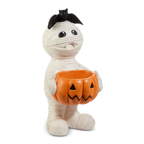 Transform your Halloween decor with this 25" Mummy Serving Butler from Raz Imports. With a playful yet spooky design, this standing mummy holds a jack-o'-lantern bucket filled with treats. Made of resin, the 12.5" L X 14" W X 25" H dimensions make it the perfect addition to your trick-or-treat station or party.