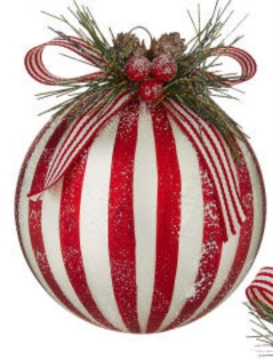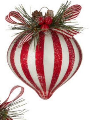 RED AND WHITE STRIPED GLASS CHRISTMAS ORNAMENT WITH BOW/PINECONE AND HOLLY