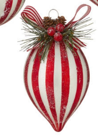 Beautiful red and white glass ornaments, each ornament features stripes from top to bottom, topped with bow, small pine cones and holly. Covered with snow and glitter
