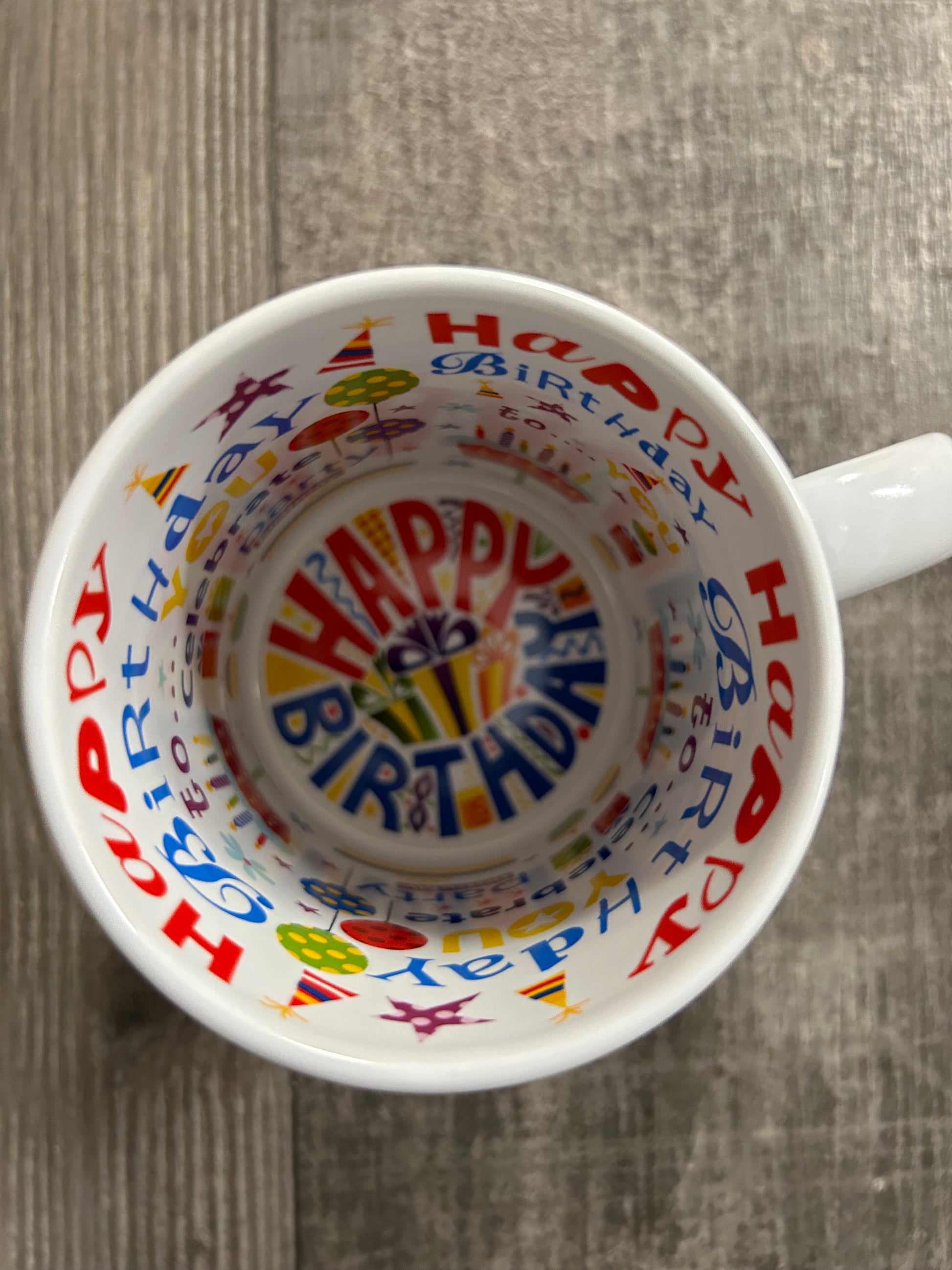 White Mug with Black Writing, 50 is in red. Inside of mug features sentiments; Happy Happy Birthday, Celebrate, Party, Happy Birthday to you. Featuring pictures of cakes, presents and balloons all in assorted colours.