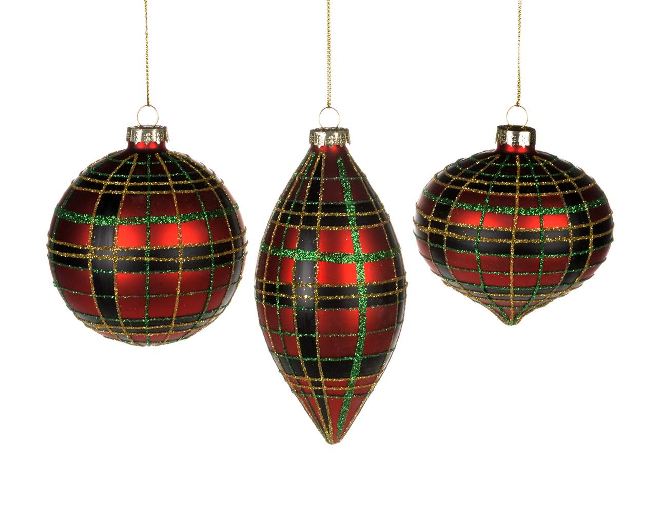 HAND PAINTED RED PLAID CHRISTMAS ORNAMENTS 8- 13 CM "Set of 3"