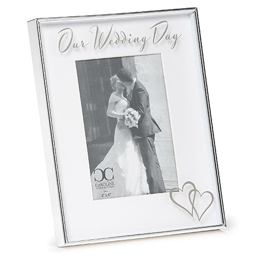 Celebrate your special day with this elegant 8.75"H OUR WEDDING DAY FRAME. Its floating 4x6 CAROLINE COLLECT design showcases your favorite photo, while the zinc alloy material ensures its durability. Add a touch of sophistication to your home with this lead-free frame.