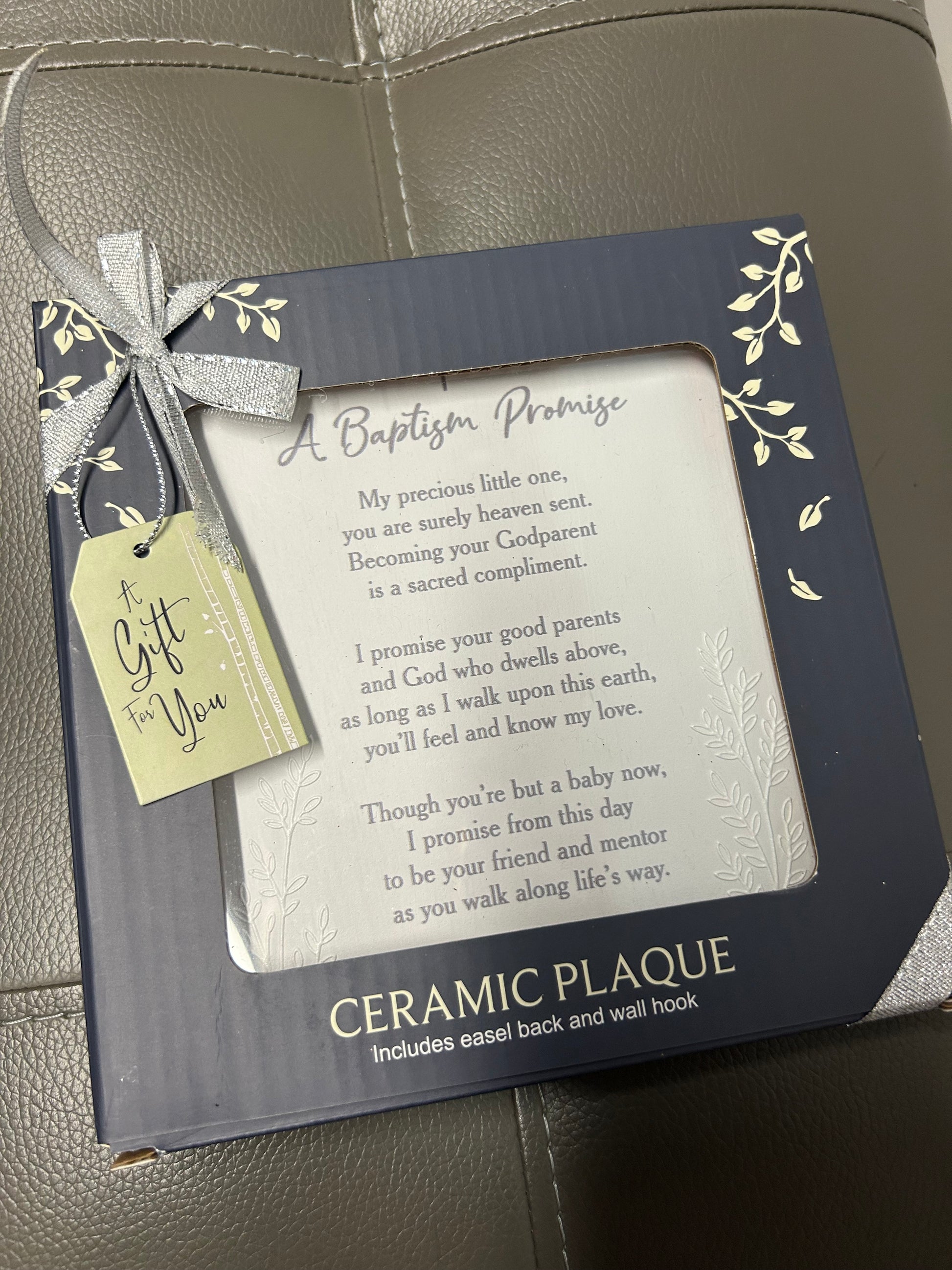 Ceramic Plaque with lovey sentiment. Reads “A Baptism Promise; my precious little one, you are surely heaven sent. Becoming your godparents is a sacred complement. I promise your good parents and God who dwells above as long as I walk upon this earth you’ll feel and know my love. Though you’re a baby now, I promise from this day to be your friend and mentor as you walk a long life’s way.”