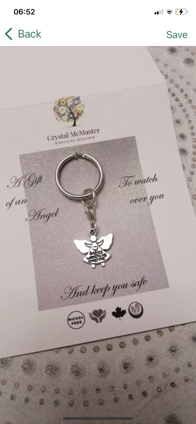 Angel Charm on Key Ring. Card has sentiment “a gift of an Angel to watch over you.” Charm reads Angels watching over me. Charm approximately 2cm diameter.