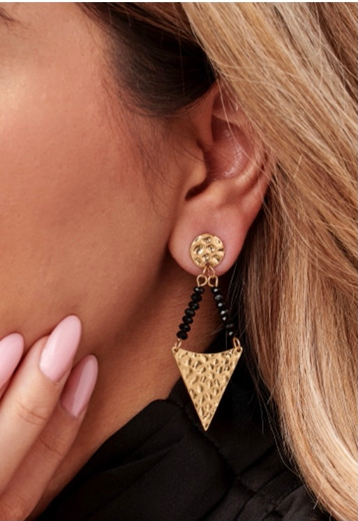 These statement dangler earrings feature black glass beads & a perfectly balanced triangle drop. Disc back. Length: 2.25in. Antique Gold tone. 80% Brass, 20% Glass Beads.