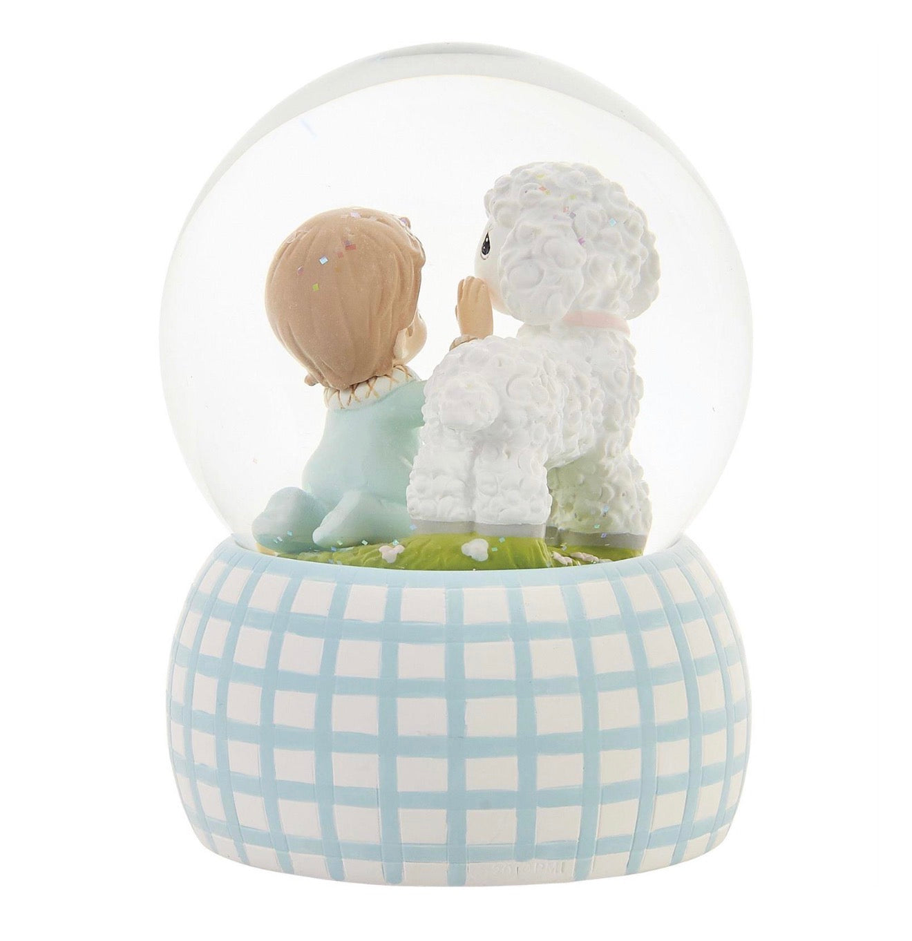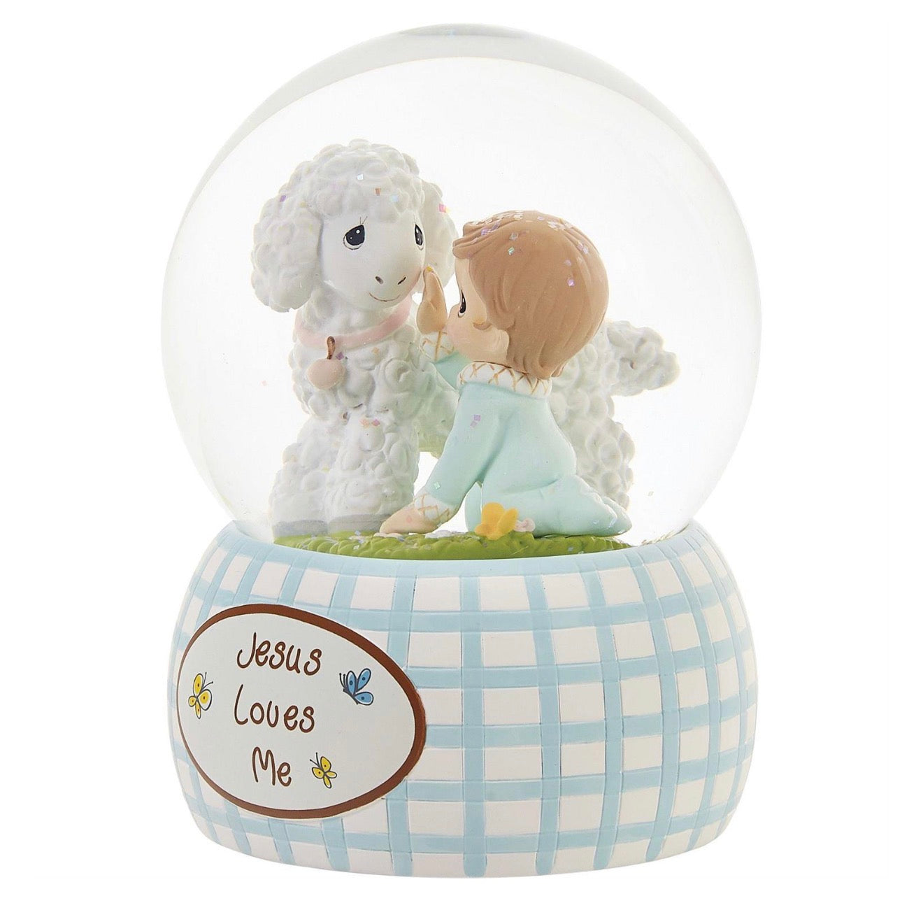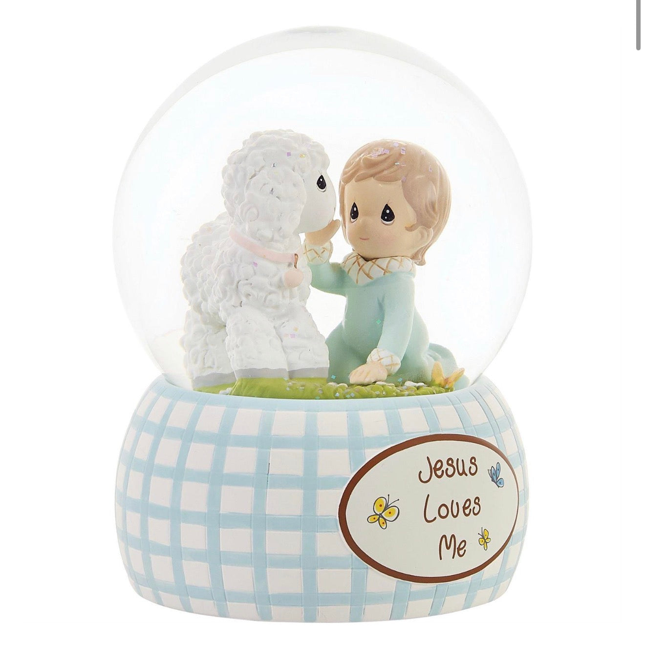 A peaceful scene of a baby boy and gentle lamb rests beneath softly swirling glitter, paired with a blue checkered base and the tune “Jesus Loves Me.” A comforting keepsake for nurseries, baptisms, or welcoming a new little one with faith and warmth.