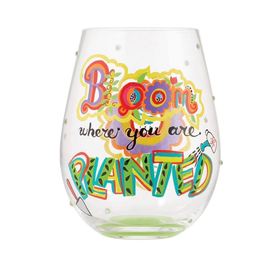 This stemless wine glass by Lolita encourages us to bloom where we're planted. We can't always control where we're at in life, but we can always make the most of where we are. This colorful glass features chromatic script and a bright flower design.