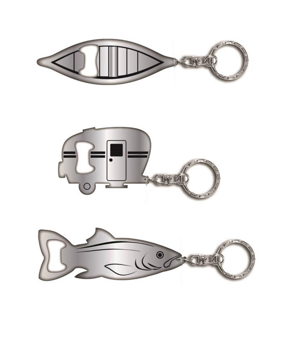 Keep your beer bottle opener close by with this metal keychain. Available in 3 assorted designs: Canoe, Trailer, Fish