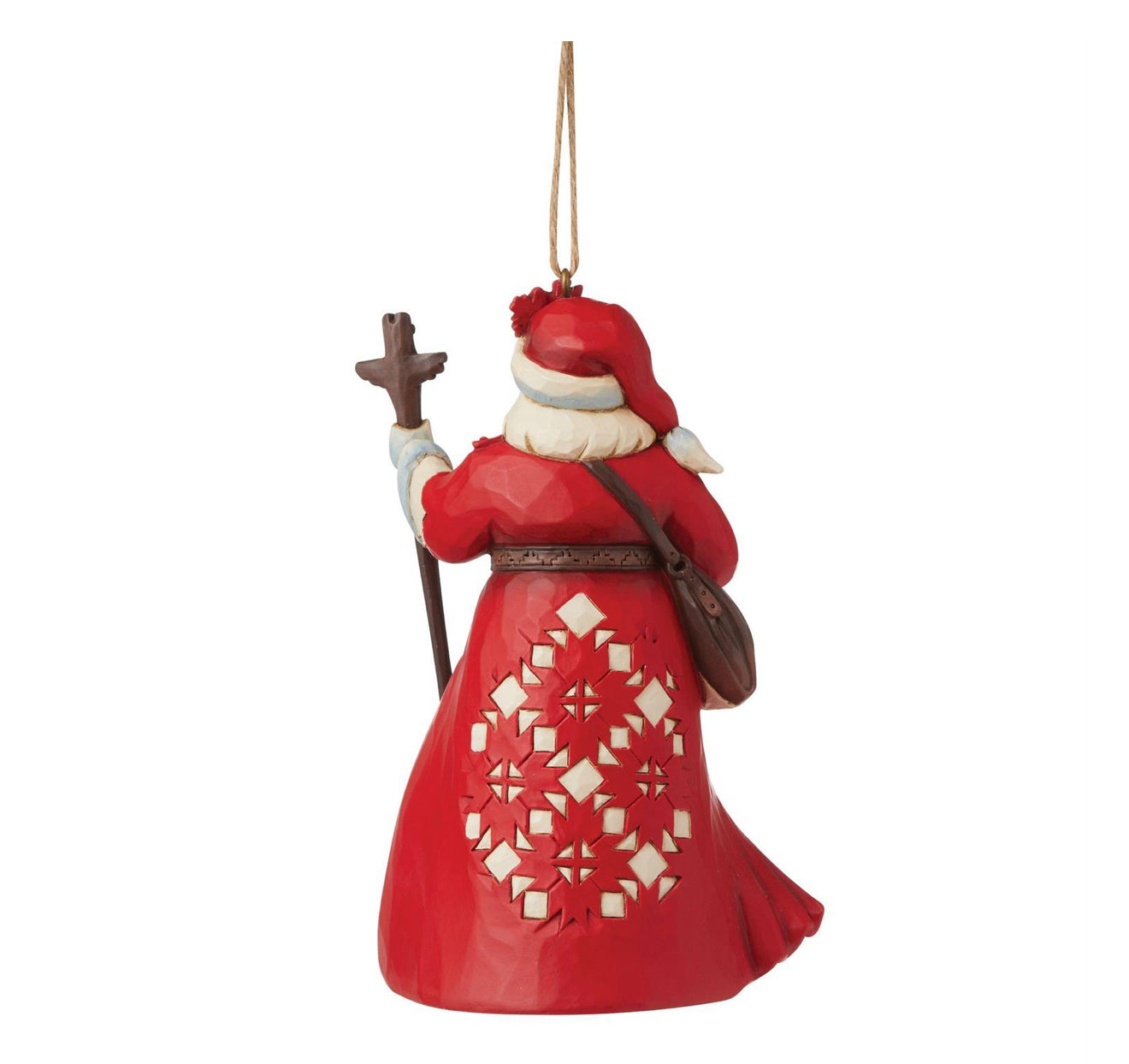 Jim Shore's Christmas Around the World collection celebrates seasonal customs near and far. This unique Santa ornament commemorates Canada at Christmastime. Carrying a maple leaf satchel, Santa's cloak reveals a stunning northern nature scene.