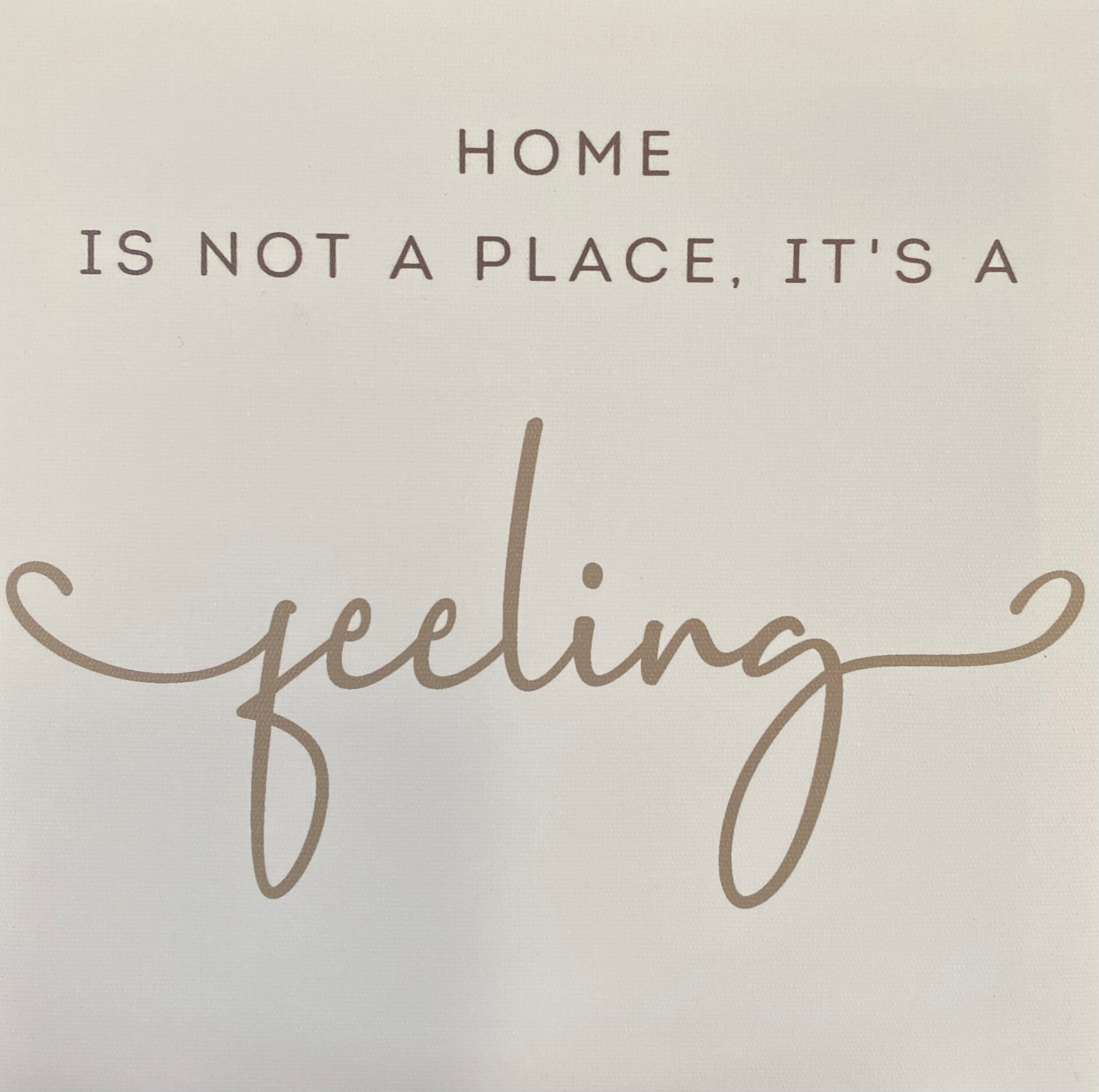 White canvas prints with sentiment in neutral colors. 3 sentiments include: WHAT I LOVE MOST ABOUT MY HOME IS WHO I SHARE IT WITH., HOME IS NOT A PLACE, IT'S A FEELING, HOME IS WHERE OUR STORY BEGINS. Stretched canvas over a MDF frame. Canvas, MDF.