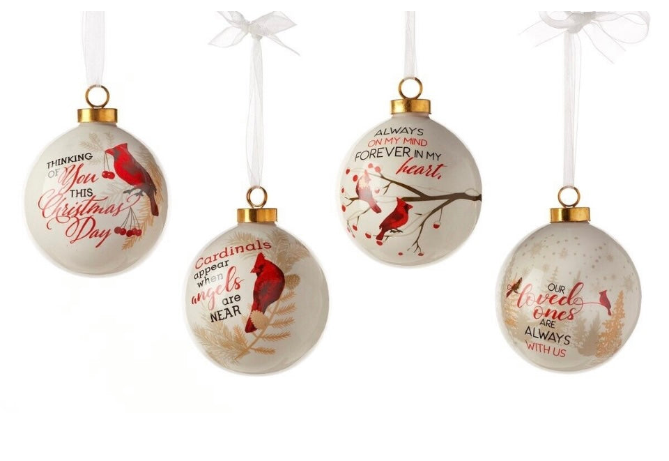 Christmas Memorial Ornaments, Cardinal with Sentiment Ceramic 3.8" High, 4 Assorted