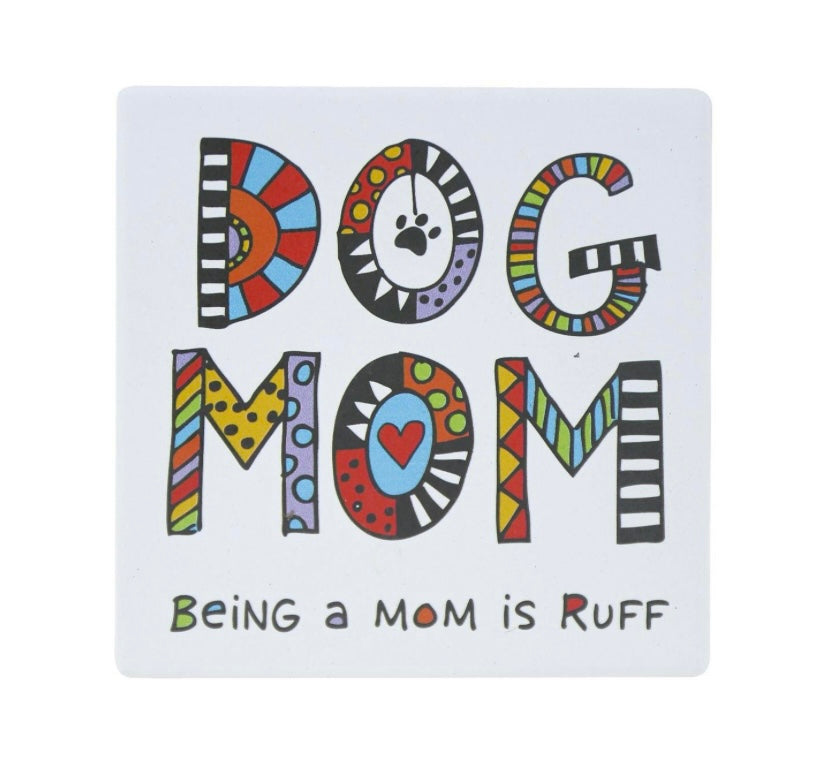 This colorful coaster from the Cuppa Doodles collection celebrates the love of dogs. The title of Dog Mom is cheerfully written on this 4 water absorbing coaster in a delightful doodle script.