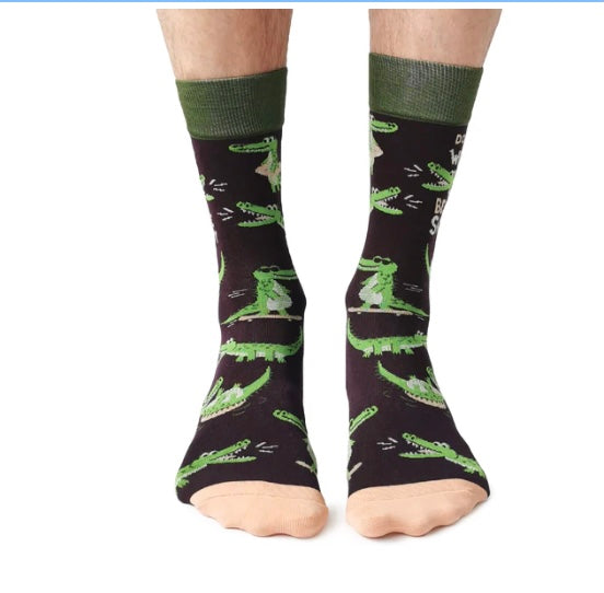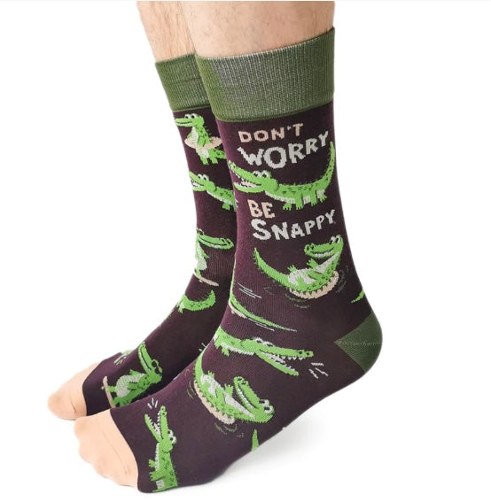 Socks feature, crocodiles with caption “don’t worry, be snappy.