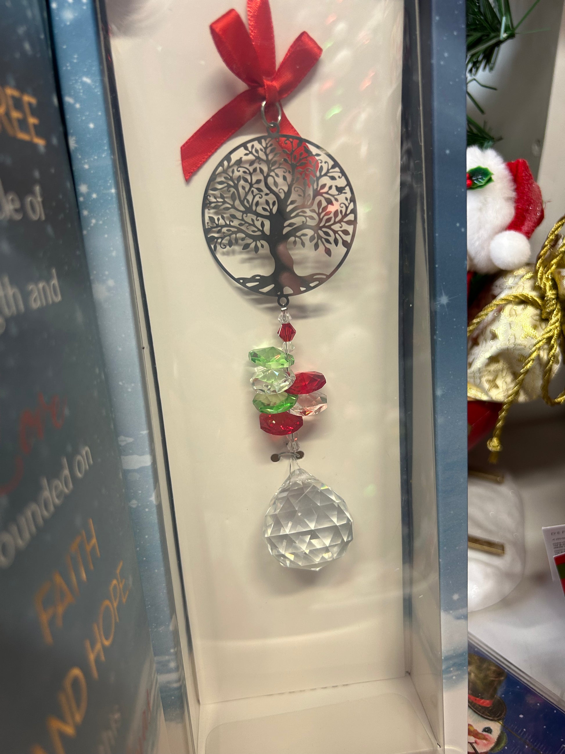 Beautiful Gift for a family member. Packaged in a complementary gift box, this tree ornament features a light pendant with twinkling red, green, clear rhinestones and a red satin hanger. Unique Gift, Metal.