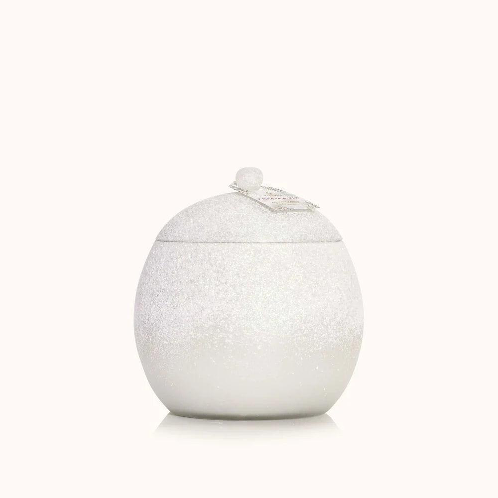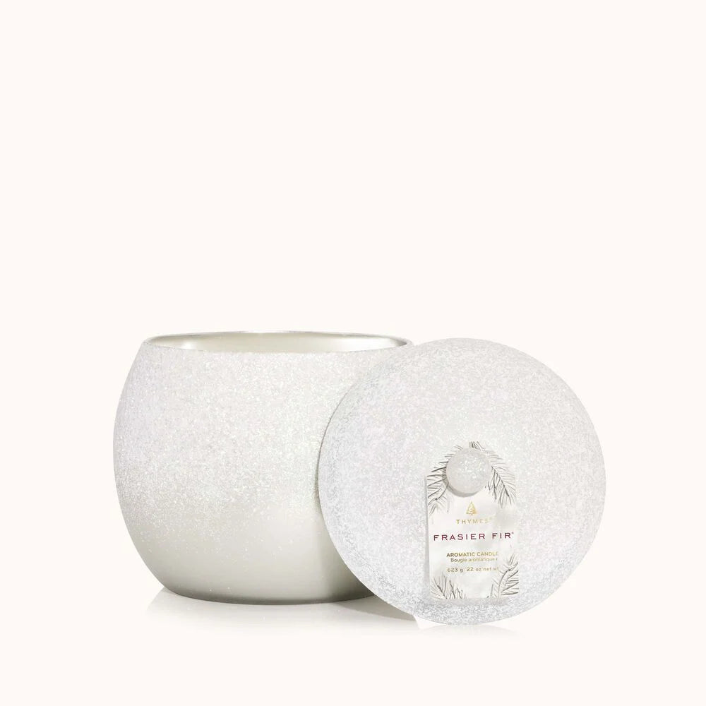 Embrace the mountain-fresh fragrance of iconic Frasier Fir with this fresh Flocked Novelty 4-Wick Statement Candle. Make a statement with this uniquely shaped vessel reminiscent of your favorite snow frosted memories.