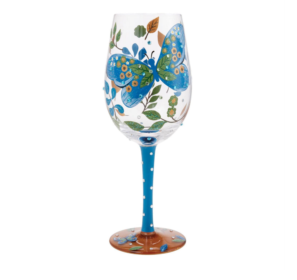 Celebrate the magic of autumn with this stunning Lolita wine glass, featuring warm blues, browns, and a cascade of glittering leaves and foliage. A gorgeous garden butterfly adds a touch of elegance, while sparkling gems make each sip magical.