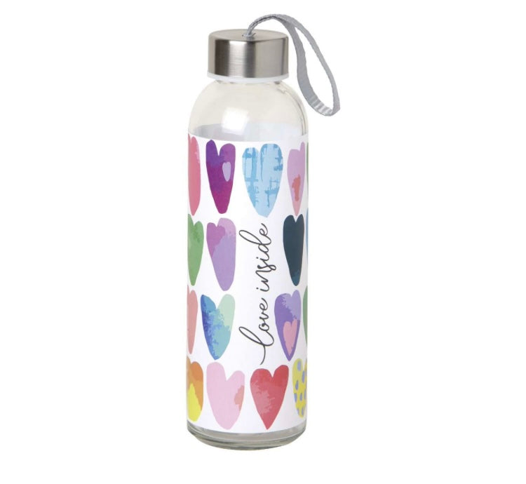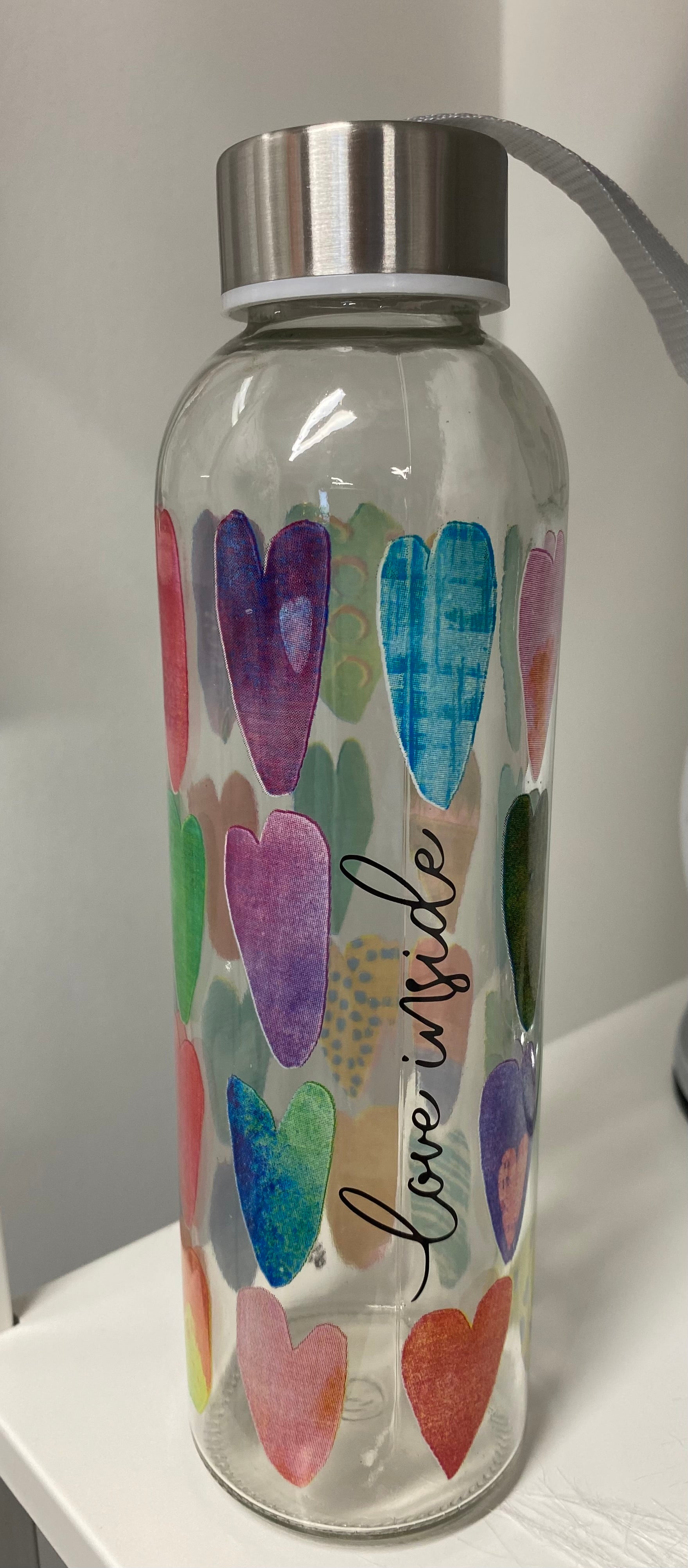 Glass -to -go drinking water bottle with sentiment “love inside.” Perfect Valentine’s Day Gift.