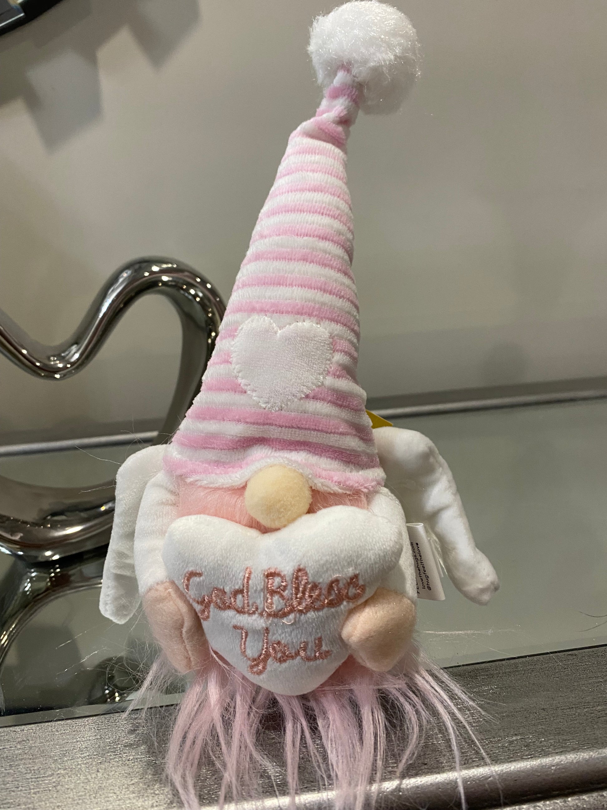 Soft plush gnome dressed as an angel holding a heart with GOD BLESS YOU sentiment. Available in 4 assorted designs: Yellow/White, Pink/White, Blue/White, Grey/White.