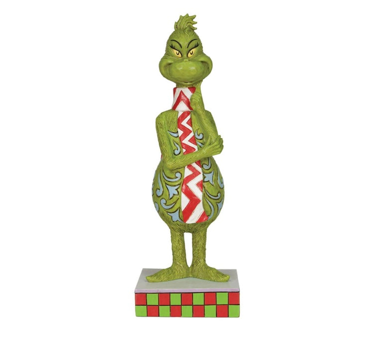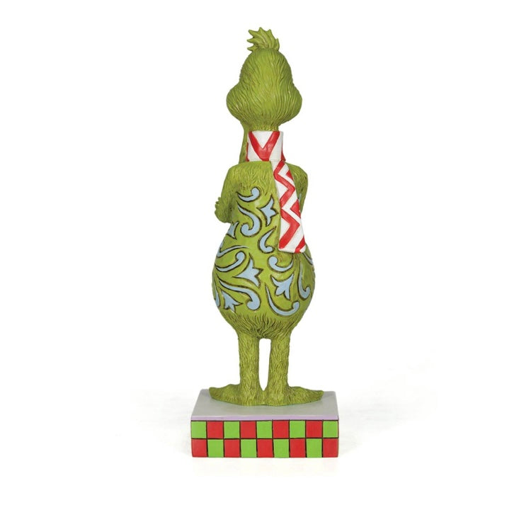 The Grinch wears a long red and white scarf around his neck in this amusing personality piece. Capturing the Christmas curmudgeon plotting his thievery, his green belly is highlighted with detailed blue rosemaling in classic Jim Shore style.