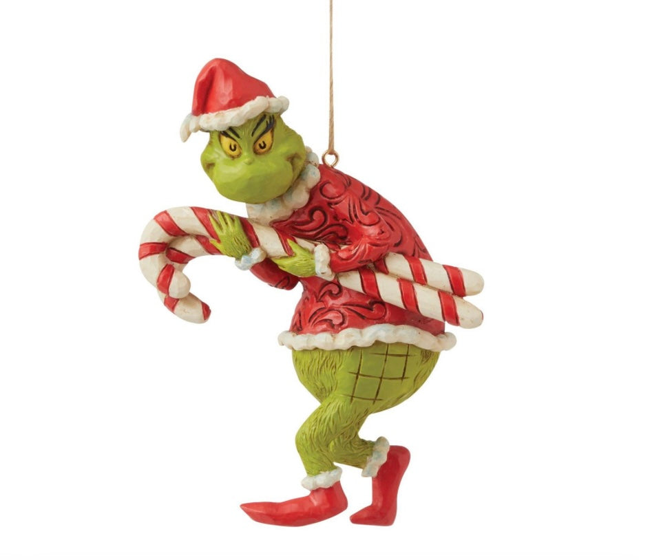 Mean and green, the only sweet aspect of the Grinch are his teeth. Stealing candy canes to soothe his sugar cravings, this Jim Shore Grinch ornament sneaks off with the goods. He's careful to tiptoe around your tree in case he is caught red handed.