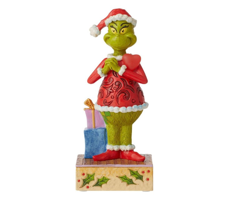 Heart bursting from his chest, The Grinch has found new meaning in Christmas. Disguised as Santa for treachery, Grinch instead learns the meaning of kindness and love. Celebrate the holiday that brings us together with this sweet Jim Shore design.