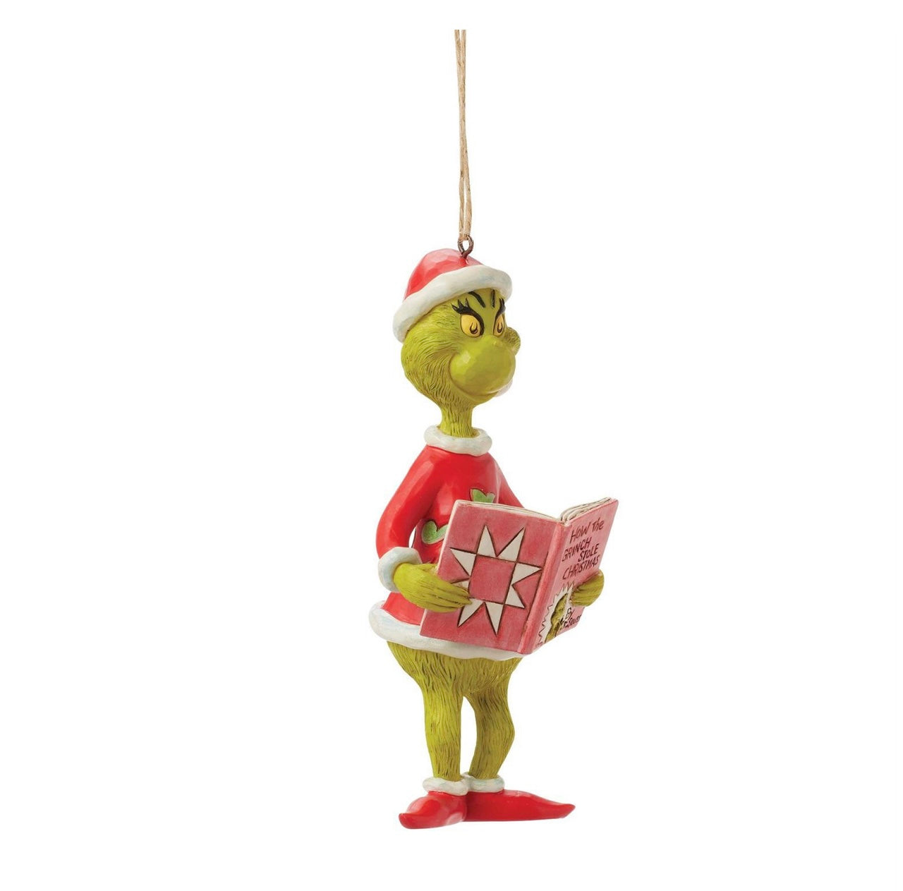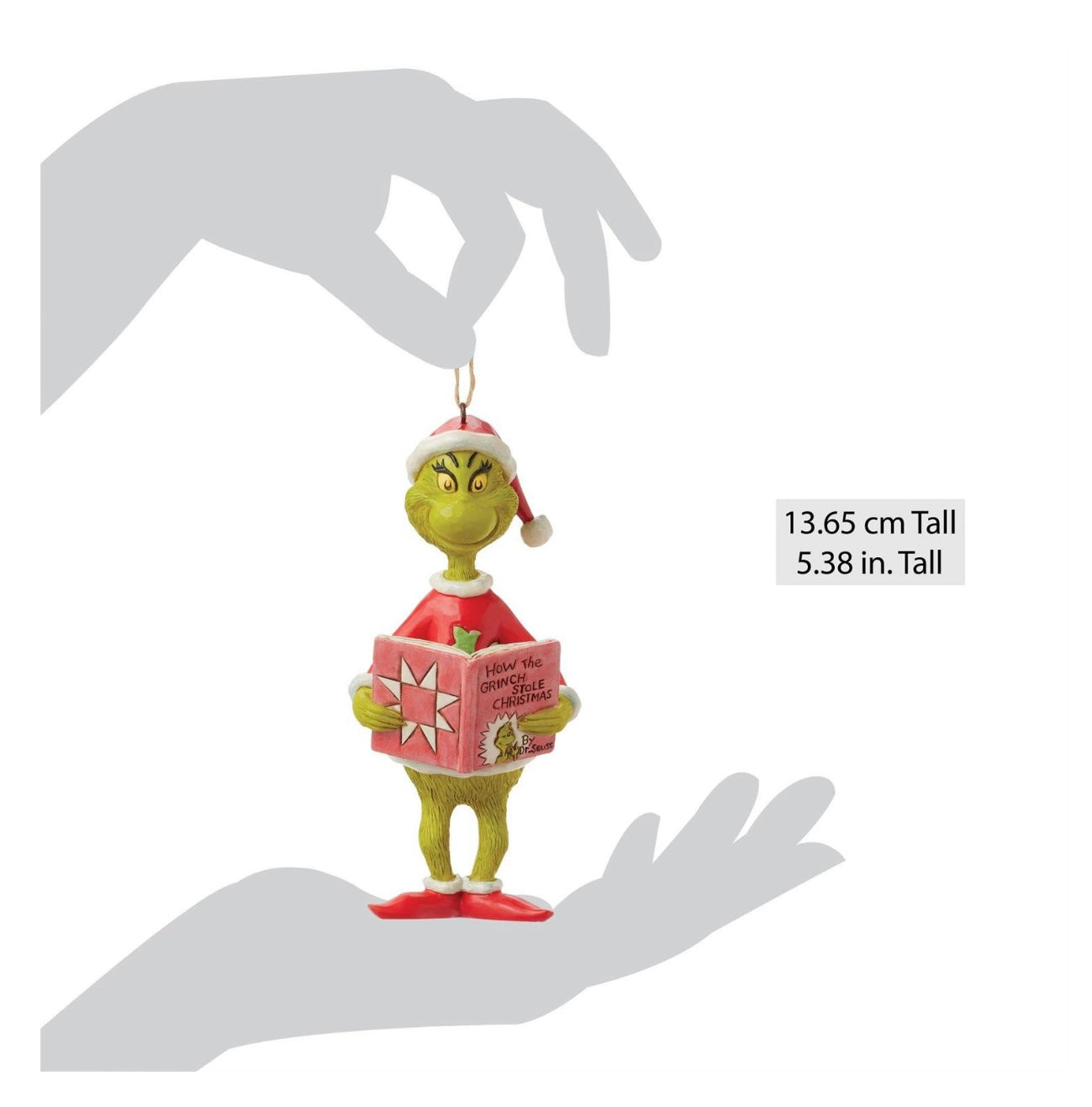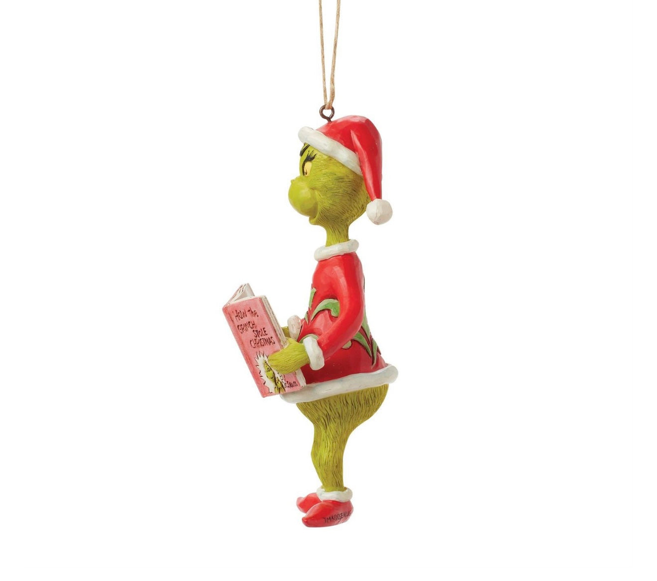The Grinch wears a rosemaling adorned Santa suit as he studiously reads a copy of How the Grinch Stole Christmas by Dr. Seuss. This Jim Shore ornament captures this whimsical scene with charming detail, as the Grinch studies his own story.