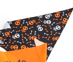 Don't forget your dog this Halloween! This fabric dog bandana is available in 3 assorted designs: Orange/WILL DO TRICKS FOR TREATS, Black/BEWARE OF WIGGLE BUTTS, Skulls and Dog Biscuits. Polyester.