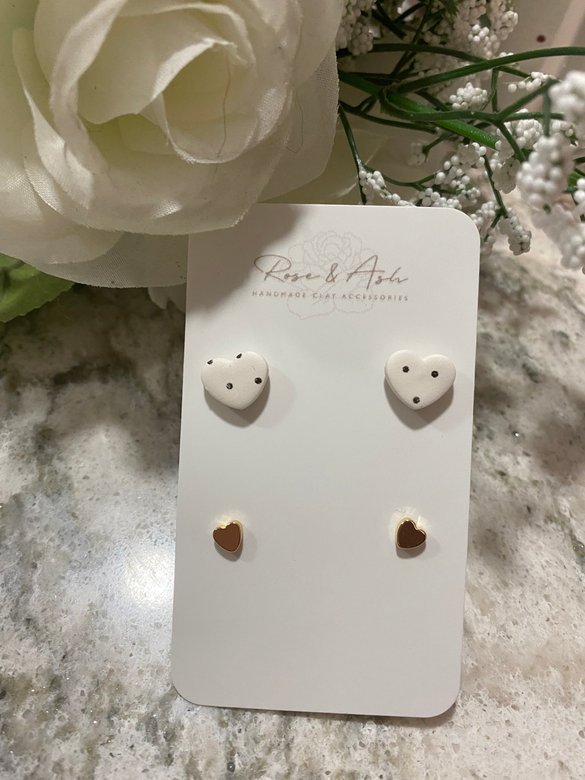 Lightweight polymer earring pack. Duo contains one pair of black and white hearts and one gold plated set of hearts.