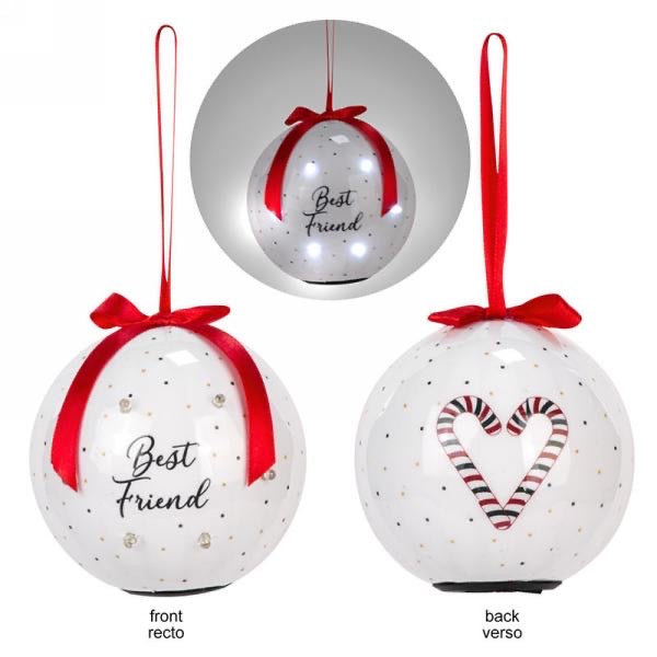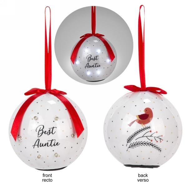 Led white ball ornament with bird image, small black/gold dots, best godmother, and adorned with red ribbon.