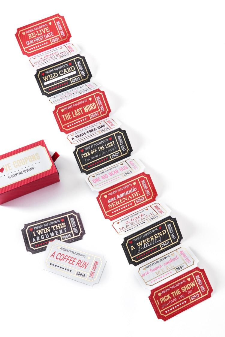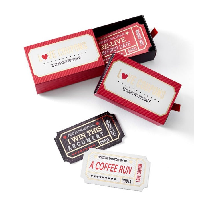 Give the gift of a coupon book filled with love promises that can be torn out and redeemed. 15 coupons per book.