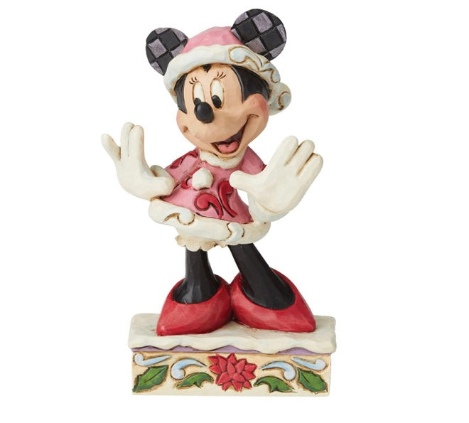 Dressed in a festive holiday dress, Minnie is excited for the arrival of the fun holiday season! This holiday Minnie is hand-crafted in stone resin and hand painted with Jim Shore's signature rosemaling design.