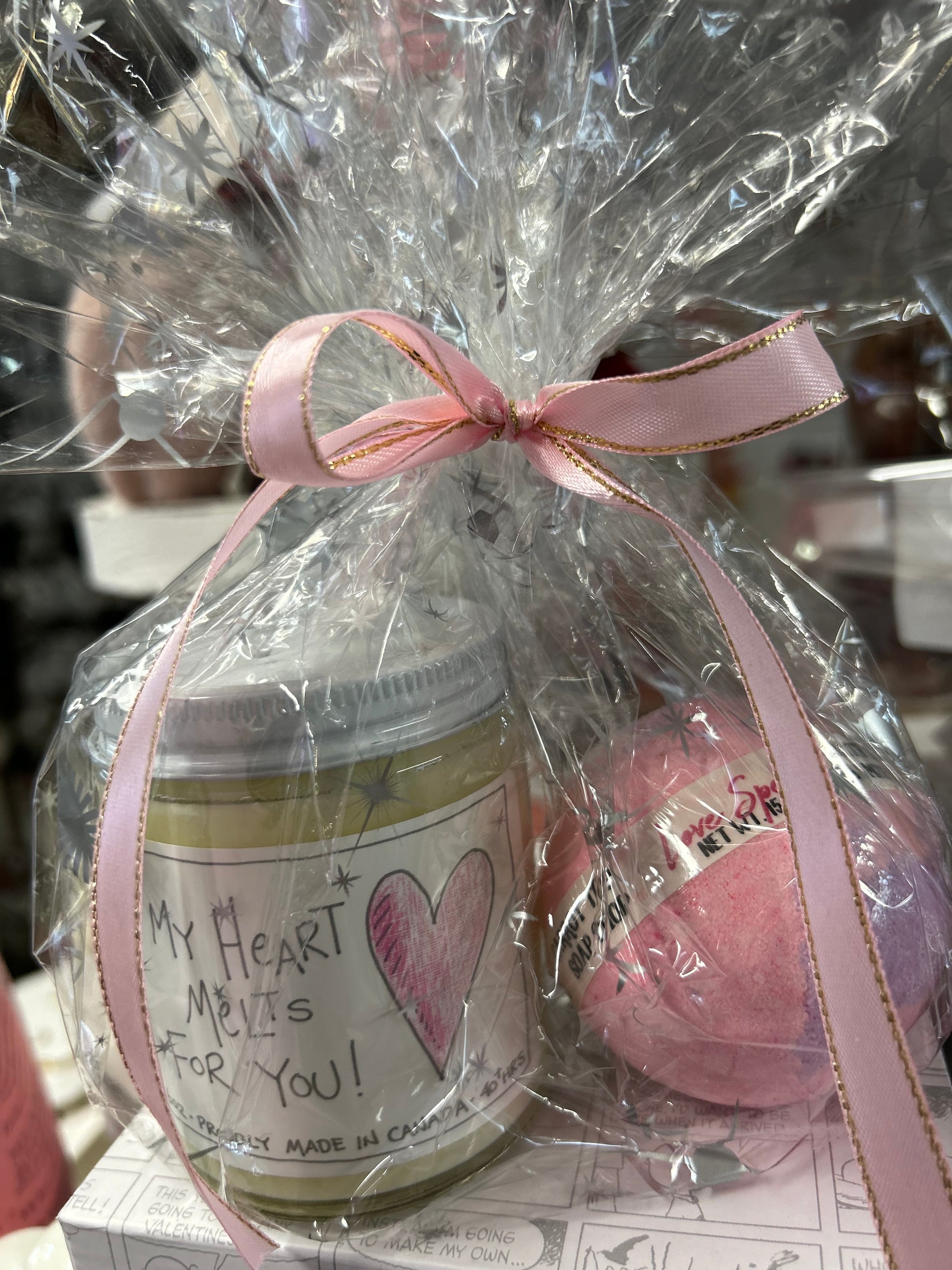 Includes Candle with Sentiment My heart melts for you 6 ounces and Love Spell Bath Bomb. Wrapped in cello with pink bow.