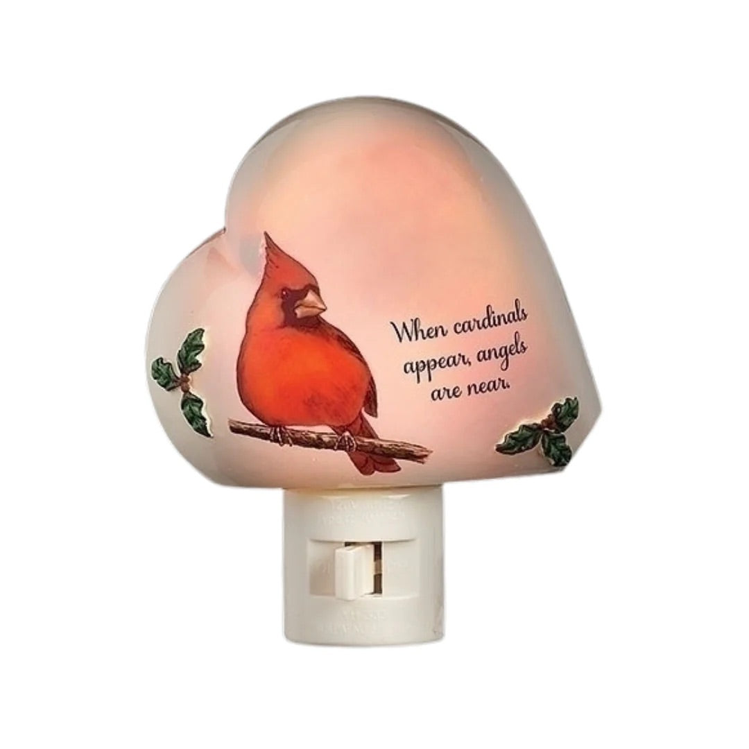 Resembling a heart, the ecru resin nightlight features holly, a red cardinal, and the phrase "When cardinals appear, angels are near." An angel appears when the nightlight is turned on; light operates from the front on/off switch. UL listed. Bulb is included. With a swivel base and rotating plug, the cardinal nightlight measures 4"Wx2"Dx4.5"H.