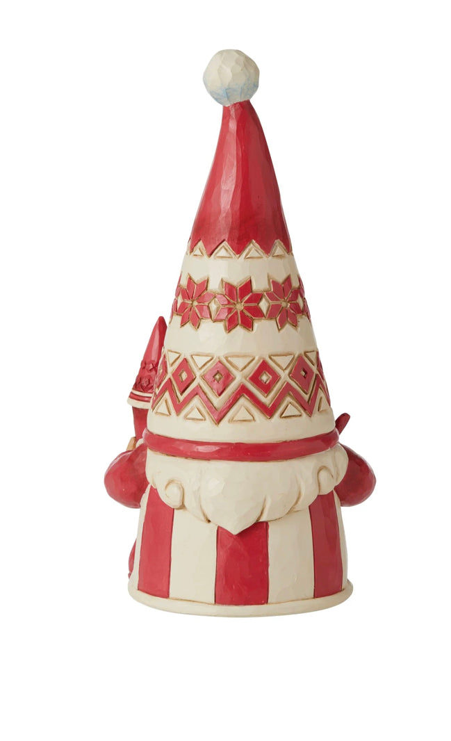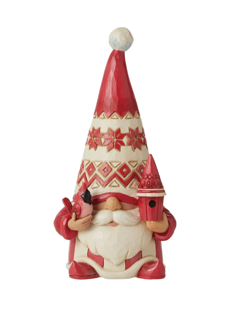 Nobody knows gnomes like Jim Shore. Creating hundreds through the years, each gnome friend is a collectible marvel of charm and craftsmanship. This Nordic gnome holds a birdhouse in one hand and a cardinal in the other, smiling in head to toe red.