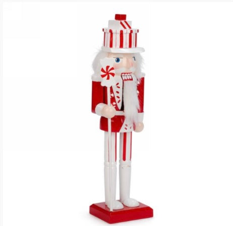 Can’t help but love this festive nutcracker! This red and white nutcracker stands tall and proud holding his candy. Red and white striped pants and hat. Faux fur hair and beard