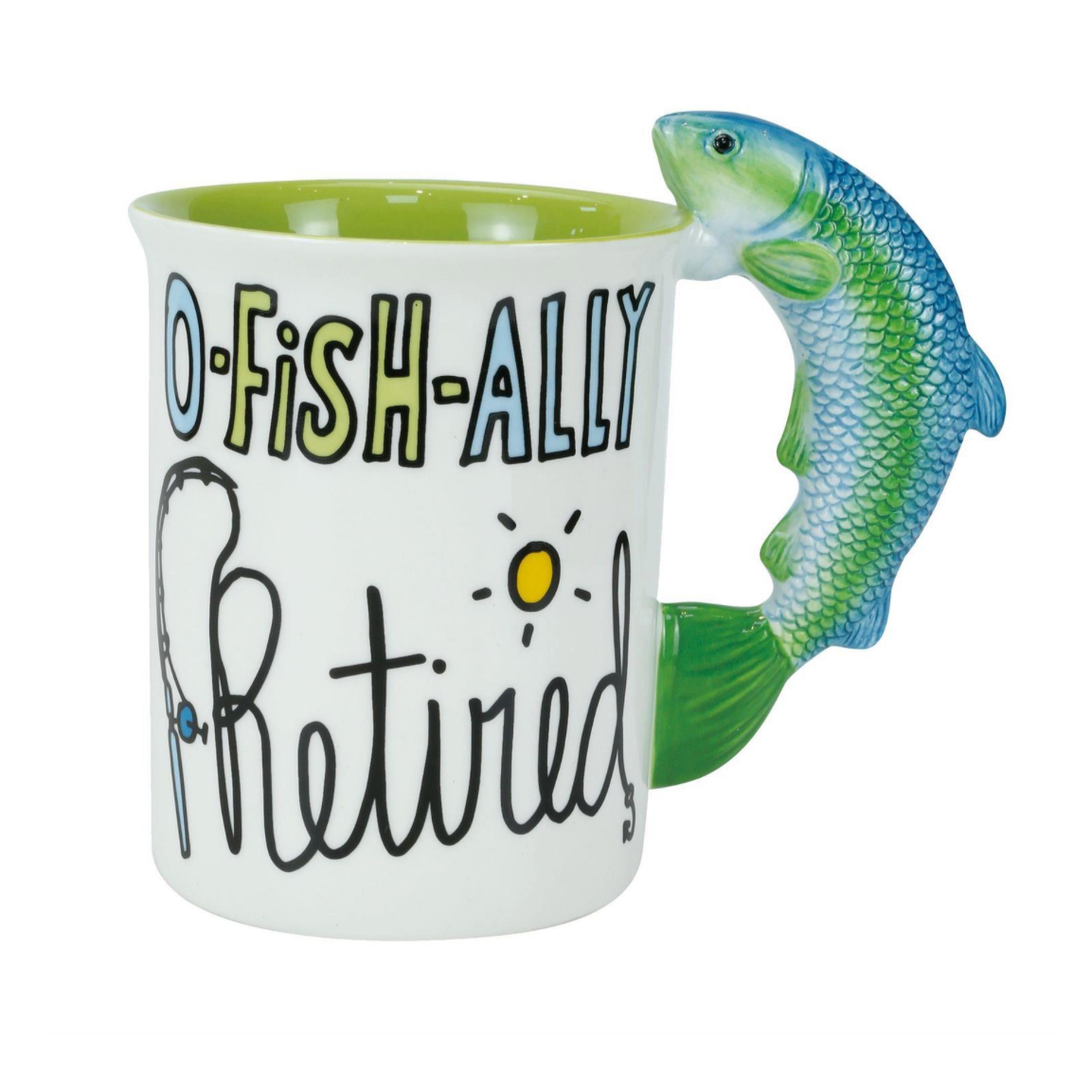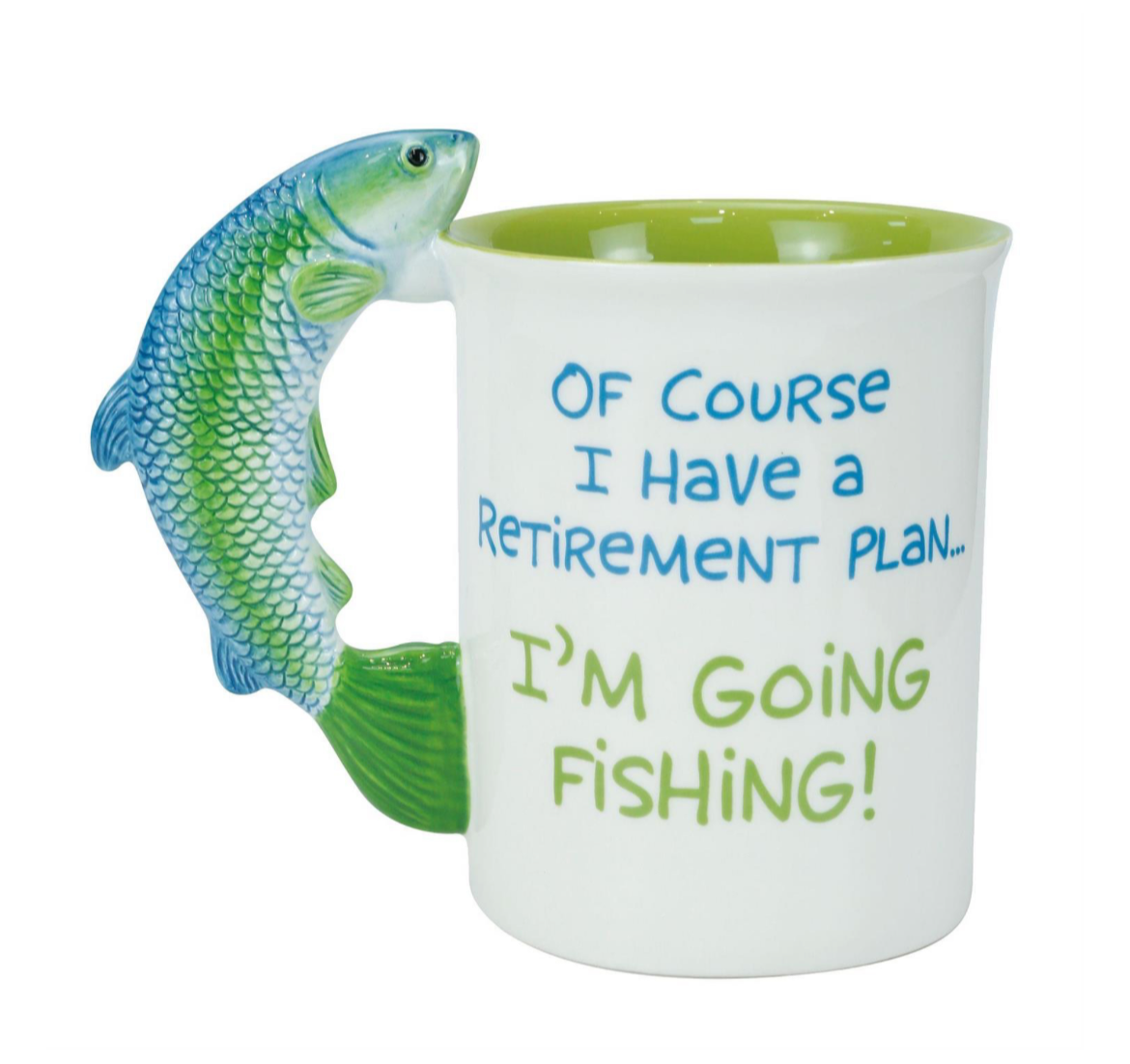 - Mug reads: "Of Course I Have a Retirement Plan, I'm Going Fishing" with sculpted fish handle