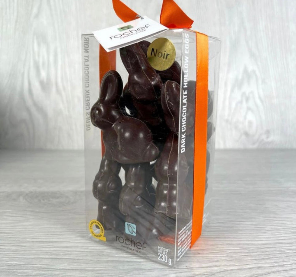 Bunnies are a combination of milk, dark and white chocolate. All carefully packaged in recyclable material. Assorted Colours.