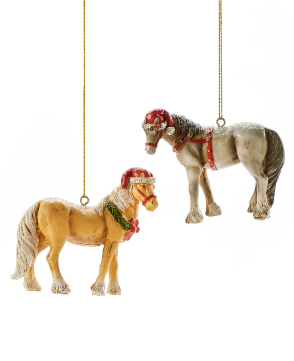 Put your love of horses on display with this horse ornament styled with a seasonal accessory. Available in 2 assorted designs: Caramel w/Santa hat & wreath, Grey w/Santa hat & bell harness. Polyresin.
