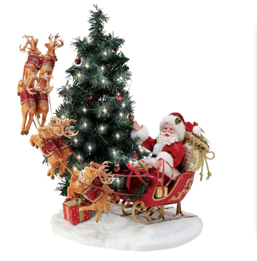 Santa is preparing to distribute presents to the well-behaved children, accompanied by his loyal reindeer pulling an elegant red and gold sleigh. They soar over a stunning Christmas tree adorned with twinkling lights and delicate decorations. This Christmas Figurine, created by Department 56, is made of resin and measures 21 inches in height, 12 inches in width, and 17 inches in length. It was introduced in January 2023 and with its meticulous details, it is guaranteed to be a beloved addition to your holiday decor. Item #: 6012249