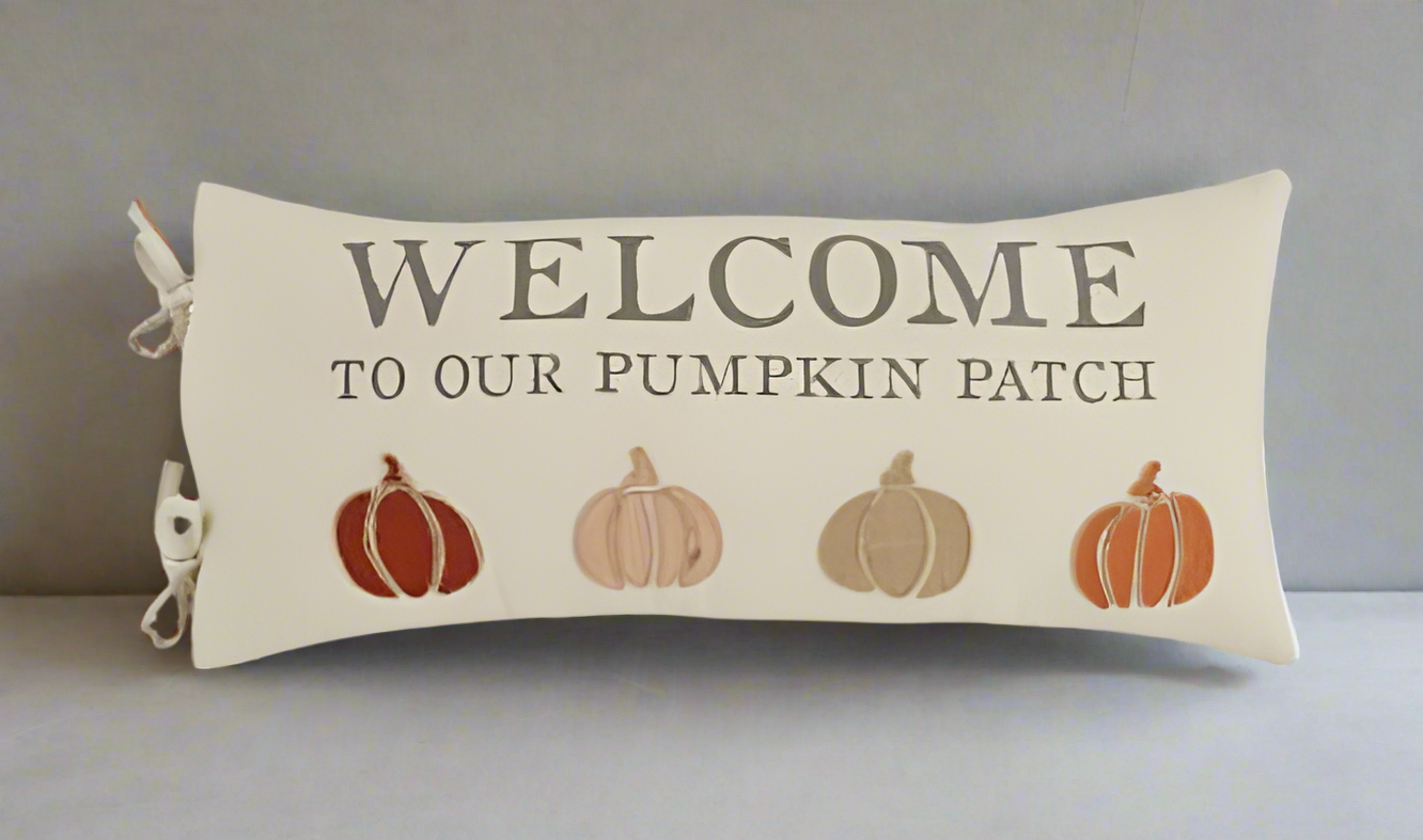 Welcome guests into your own pumpkin patch with this “Welcome Pumpkin Patch throw pillow.” The canvas pillow features a jute twine trimmed pumpkin appliques in the center and features the phrase "Welcome to Our Pumpkin Patch. The throw pillow also has side ties.
