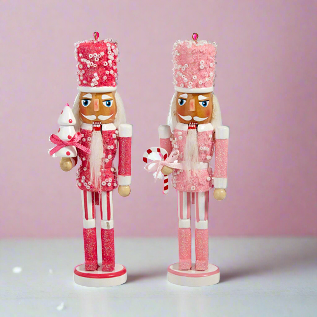 These stunning pink nutcrackers make the perfect Christmas decoration for your Christmas mantel or tabletop. They feature a dark pink or a light pink nutcracker covered in small white beads, striped leggings, and jewel accented boots! Each sold individually. Made by Raz Imports. Made of wood. Dimensions: 4"L X 4"W X 15.5"H. Item #: 4422827