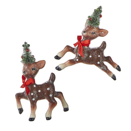 Cute deer ornament, brown plastic, legs stretched out, bottlebrush tree on head, covered in glitter.