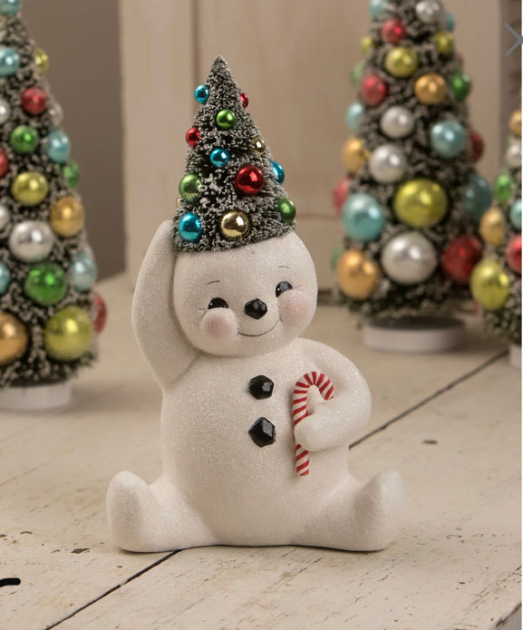 Bring home the best of retro inspired decor with this adorably chubby snowman with colorful bottle brush tree on head and candy cane in hand.