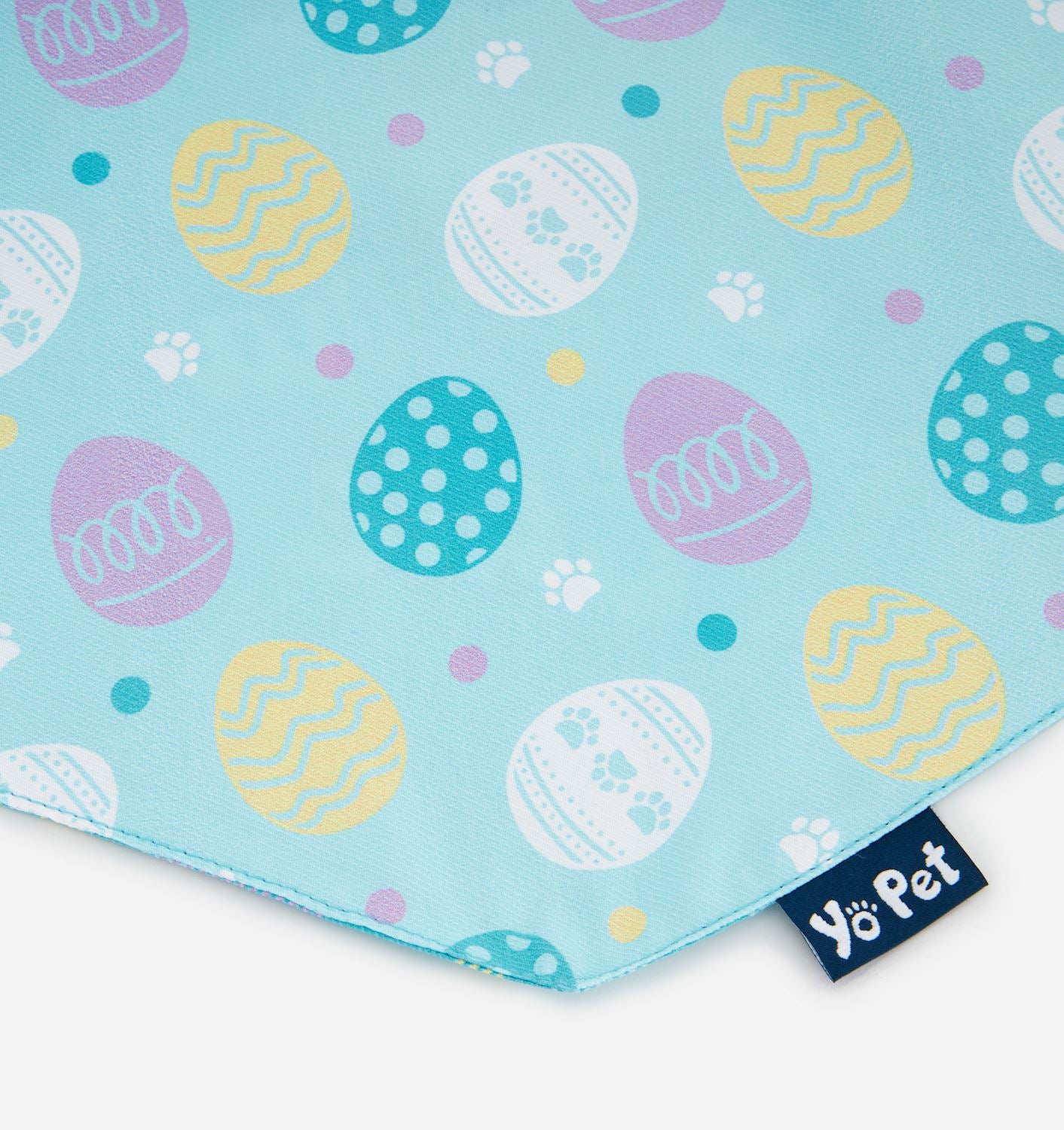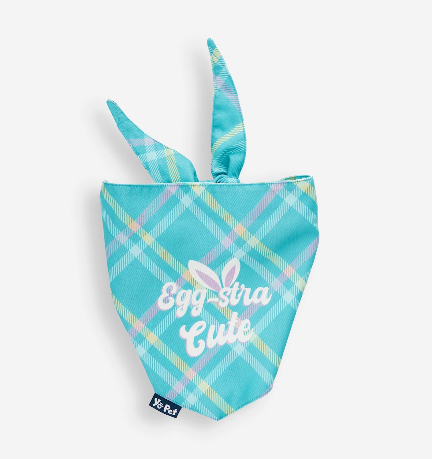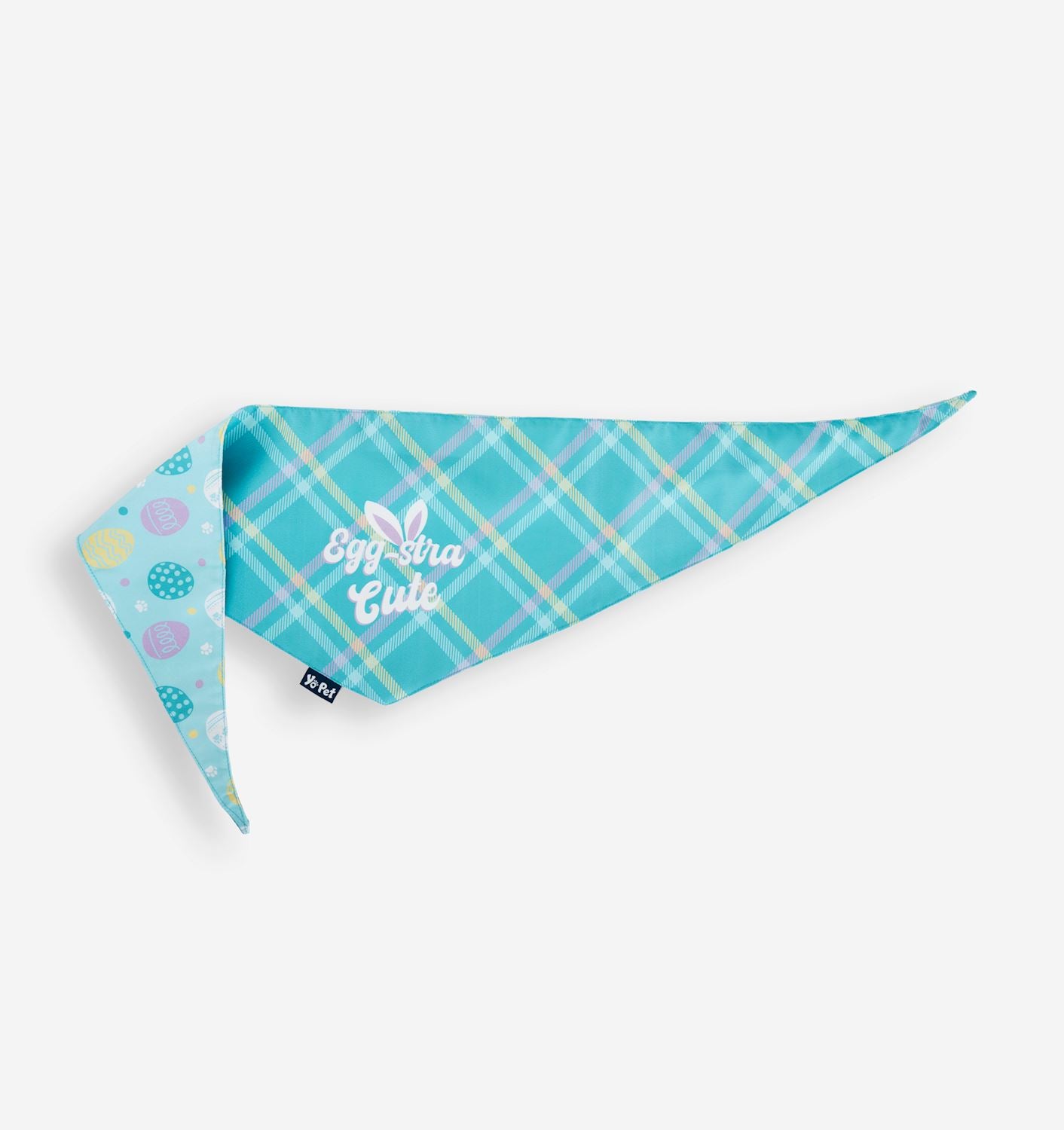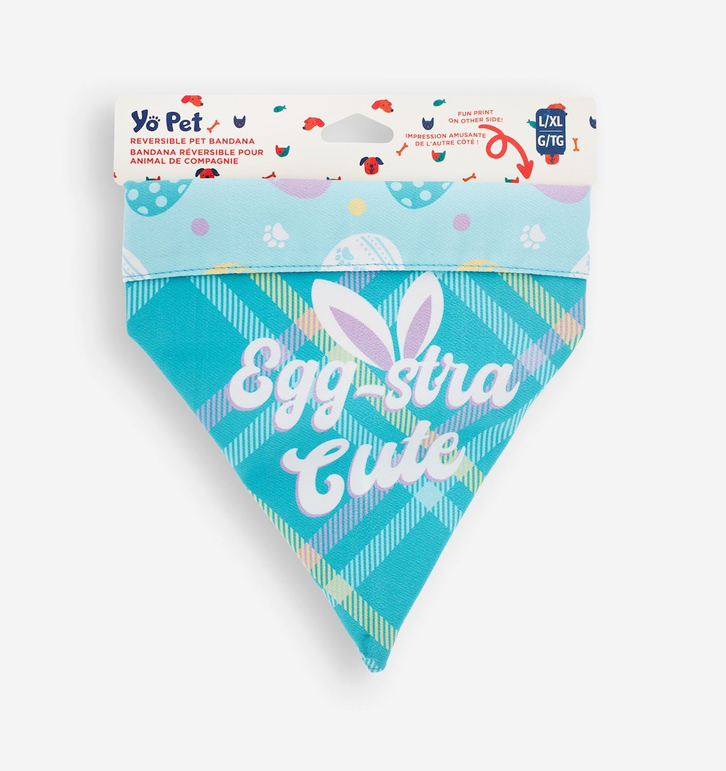 Elevate your pups style during the Easter holiday with this adorable and festive Reversible Pet Bandana. With a striped design and the sentiment EGG-STRA CUTE on one side, and an all over paw and easter egg print on the other side, this light blue pet bandana features an adjustable tie-on closure making it easy to secure around your pet's neck for a comfortable fit. Available in sizes S/M, and L/XL. 100% Polyester.