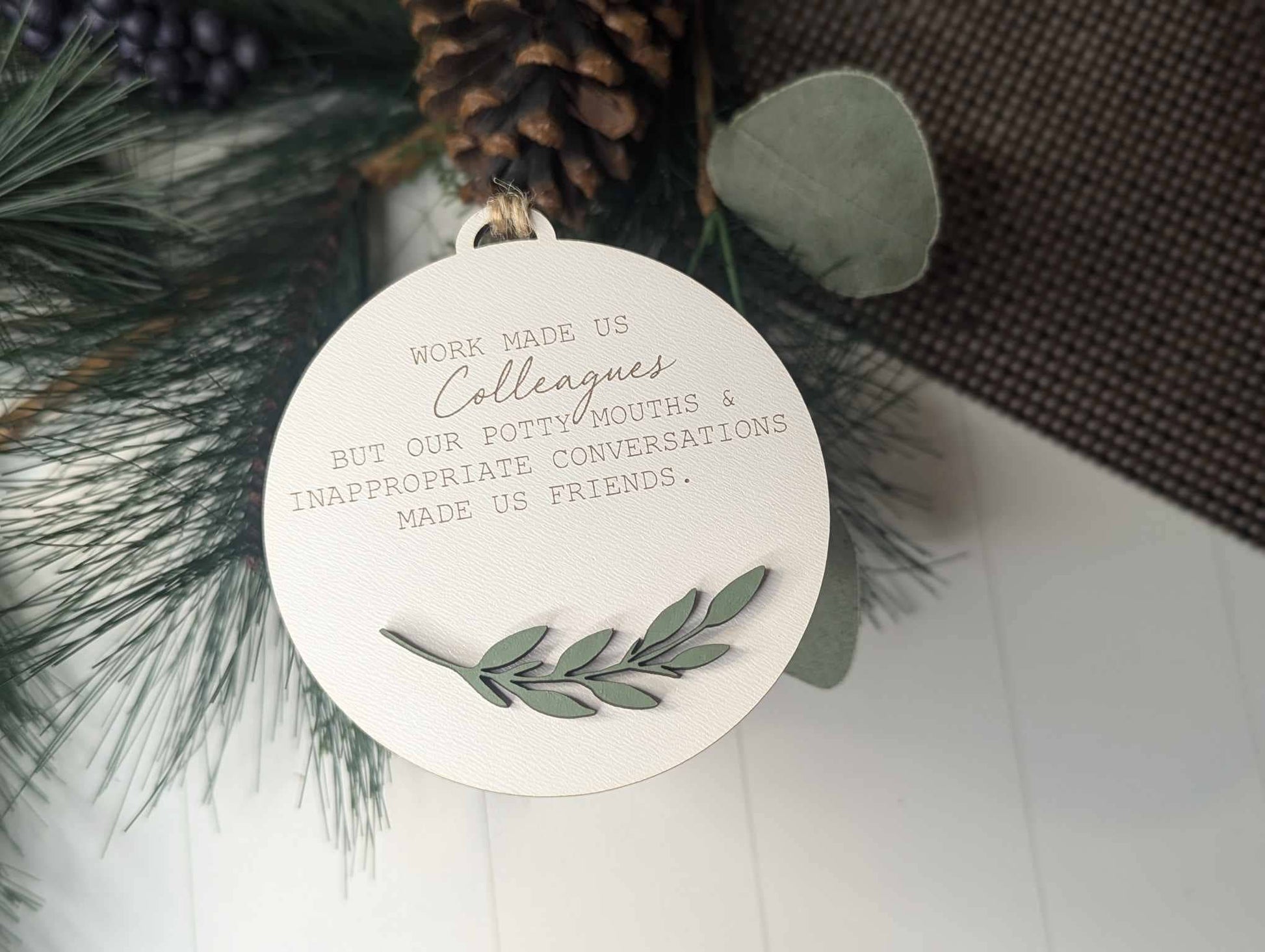"These beautiful ornaments are laser cut and engraved and feature a hand painted 3D laser cut leaf.