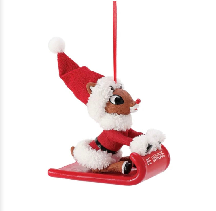 Rudolph is ready for Christmas Fun. Dressed in a Clothtique fabric Santa hat and trimmed in fur, this ornament will dress up your tree!