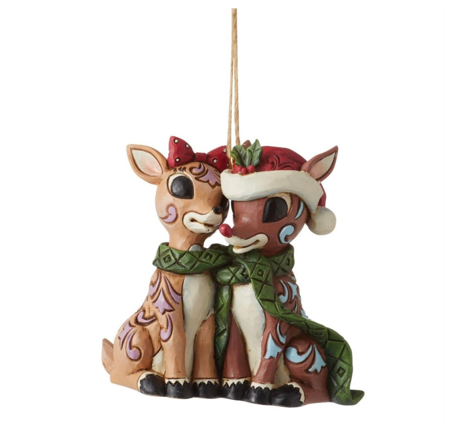 Is there anything more heartwarming than young love? Reindeer calves, Rudolph and Clarice, share a scarf in this touching ornament by Jim Shore. With rosemaled details and holly, these two couldn't be sweeter. Celebrate the season with love.