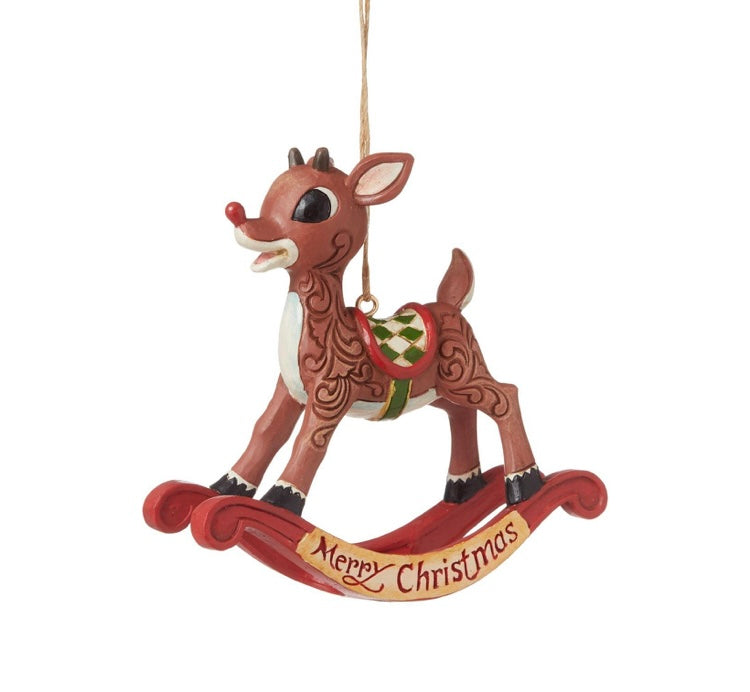 Celebrate the holiday season in style with a true Christmas classic, Rudolph the red-nosed reindeer. Crafted into a rocking horse, this beautiful Jim Shore ornament teeters with nostalgia. Rock around the Christmas tree with Rudolph.