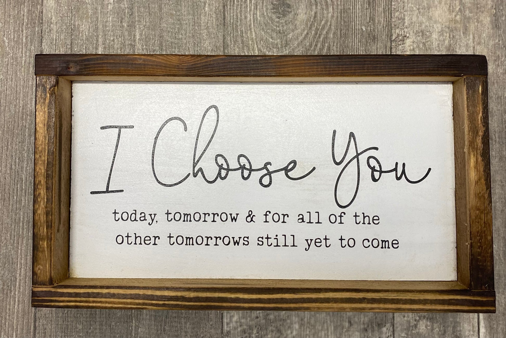 Rustic Wooden Sign with sentiment “I choose You today, tomorrow and for all the tomorrows still yet to come.” Each Strong N Free CDN Wooden Sign is designed and handmade in Victoria BC (Vancouver island). Each sign is handmade with high quality, 100% solid wood. Wood is distressed by the company to finish off that farmhouse look we all love. A clear coat on the sign front for added protection. Signs can be hung. Hanging hardware will be included but NOT installed. Each sign - comes with an easy to install saw-tooth hanger.